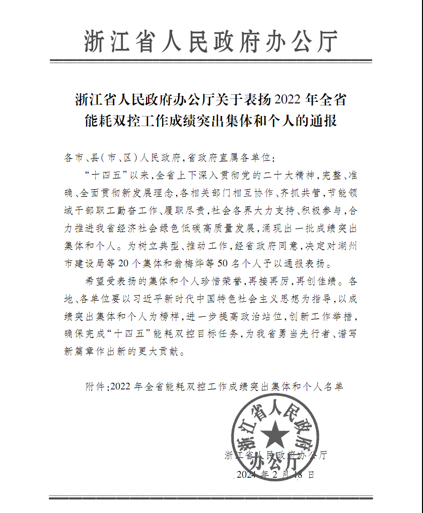 新年伊始,省政府辦公廳下發《關于表揚2022年全省能耗雙控工作成績突出集體和個人的通報》,浙江永強集團股份有限公司設備科科長王勤偉榮獲成績突出個人。